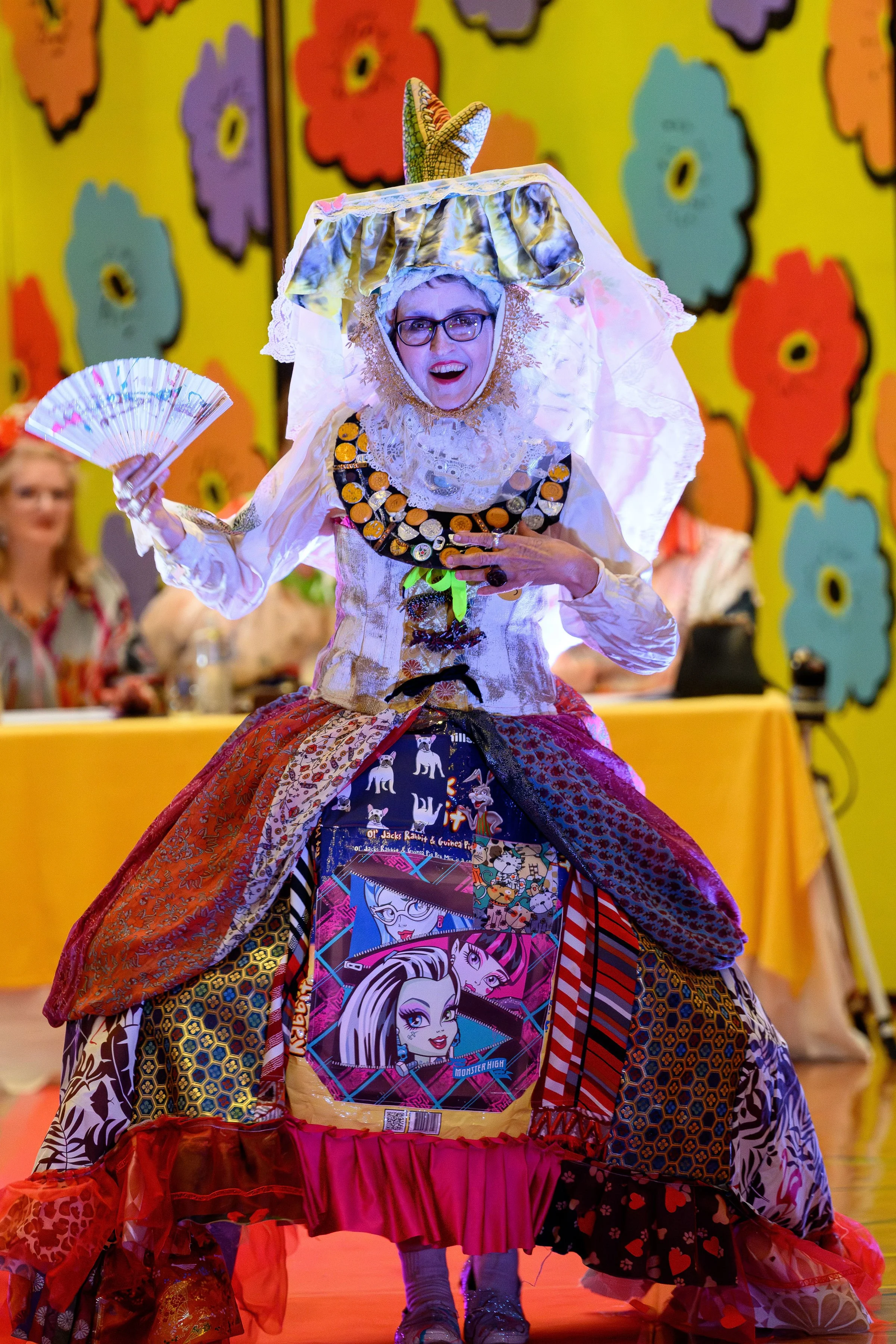 Jan, we loved the title ‘Fiasco’ and your explanation, but more importantly we all treasured seeing Lucy, your granddaughter in your futuristic outfit paraded (skipped) down the runway with total ‘glee’ and confidence. She highlighted your crocheted VHS tape and shining CD/DVDs headdress ‘bopping’ along to the music with joy. Nothing to do with the headdress category, but we did also enjoy the ‘cheeky’ little glimpse of pink tulle under the VHS video tape. Lucy, you starred!